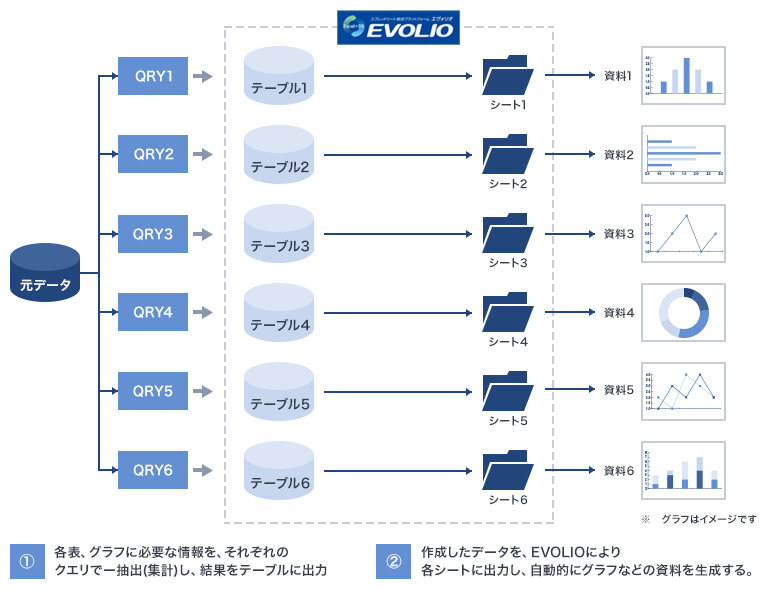 各表・グラフに必要な情報をクエリで抽出し、テーブルに出力したうえで、EVOLIOにより各シートに出力し自動的に資料を生成できるようになった。