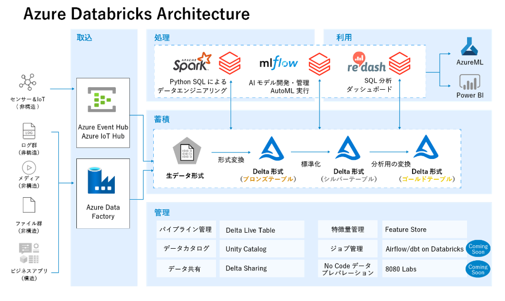 Databricksの主な特徴は、「レイクハウス」という単一プラットフォーム上で、データ収集から分析、機械学習(ML)モデル開発・運用までを一気通貫で効率的に行える統合基盤である点です。データエンジニア、データサイエンティスト、ビジネスユーザーが協力しやすく、高速なバッチ/ストリーミング処理、MLOps、AI(生成AI含む)機能の強化、オープンソースとの連携、マルチクラウド対応