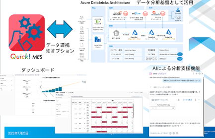 Databricksの活用活用事例として弊社サービスQuickMESで発生した製造業における生産実績をDatabricks上にデータを連携することで、ダッシュボードやお客さま自身でAIを使ったデータの分析について提案させて頂いております。